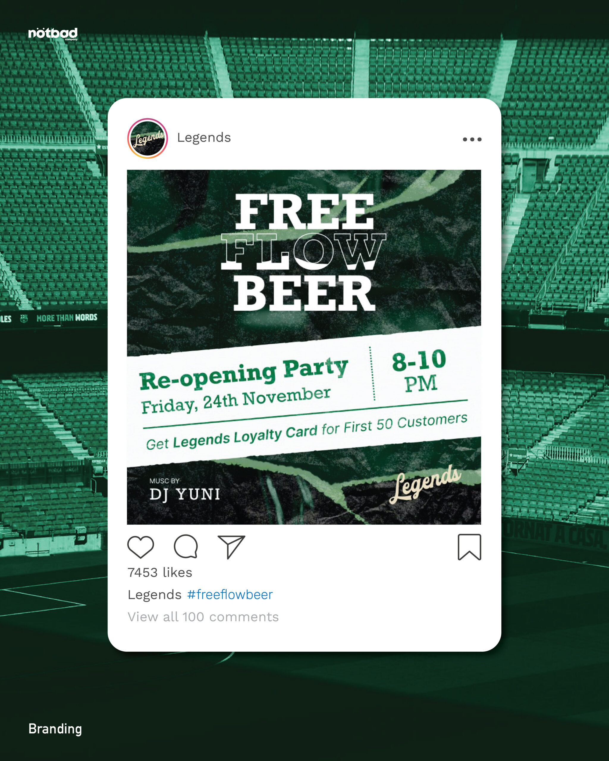 Our approach centered on authentic community energy: live sports moments, DJ nights, ice-cold beers, and all the bold personalities that make Legends, well, legendary. The visual direction took cues from the bar’s signature green logo, evolving it into a consistent visual identity across posts — energetic, confident, and unmistakably Legends.